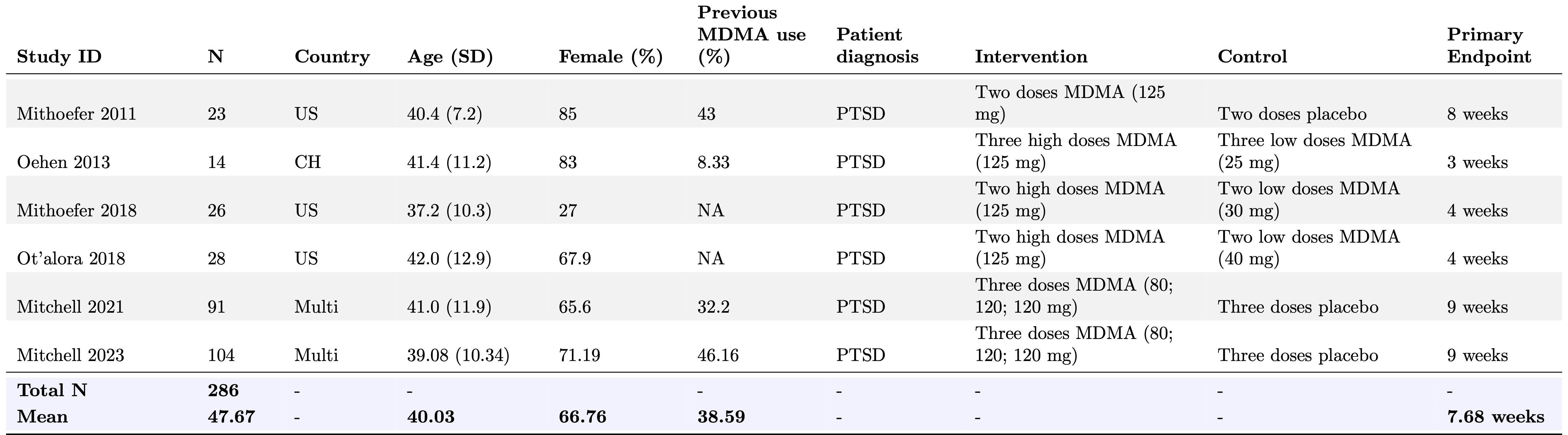 Welcome to the landing page for our living systematic review and meta-analysis on MDMA-assisted therapy for PTSD (pre-registered here)! Follow the links in our documentation section for relevant information including our code-walkthrough (reproducibility guide). Here we provide an overview on our latest results, currently up-to-date with our most recent preprint.