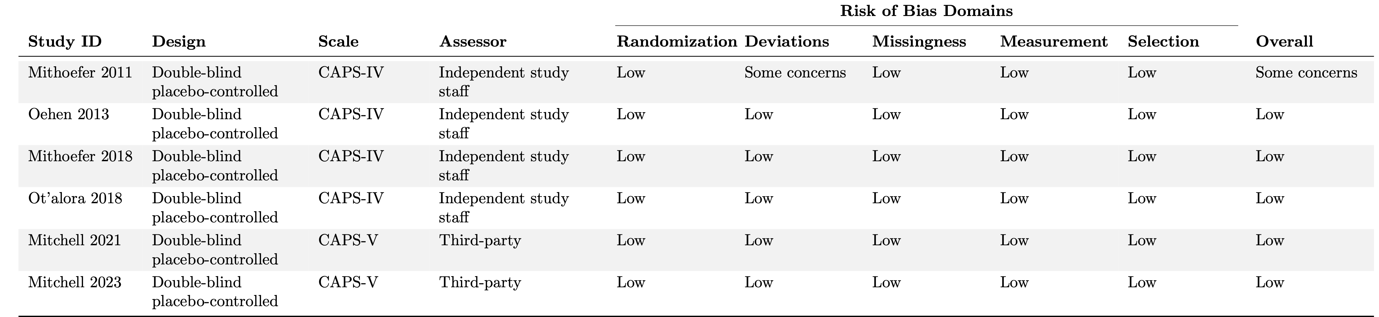 Overall, one study had some concerns (Mithoefer 2011) and five studies were deemed to have an overall low risk of bias (Table 2). Mithoefer 2011 had some concerns due to what appears to be a per-protocol study design, where dropouts were replaced with new enrollees. According to Cochrane guidelines, per-protocol study designs are not an appropriate analysis to estimate the effect of assignment to intervention. Although none of the studies had a high risk of bias, these assessments do not fully account for potential bias from functional unblinding or expectancy effects.